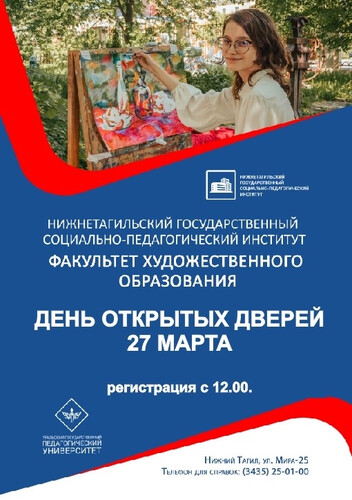 Факультет художественного образования нижнетагильского государственного социально-педагогического института (филиал) федерального государственного автономного образовательного учреждения высшего образования «Уральский государственный педагогический университет», в рамках профориентационной работы и привлечения абитуриентов в педагогическую профессию проводит 27 марта 2026 года с 10:00 по адресу ул. Мира, 25, г. Нижний Тагил профориентационное мероприятие «День открытых дверей» для обучающихся 9-11 классов и их родителей, а также для обучающихся выпускных курсов организаций СПО.