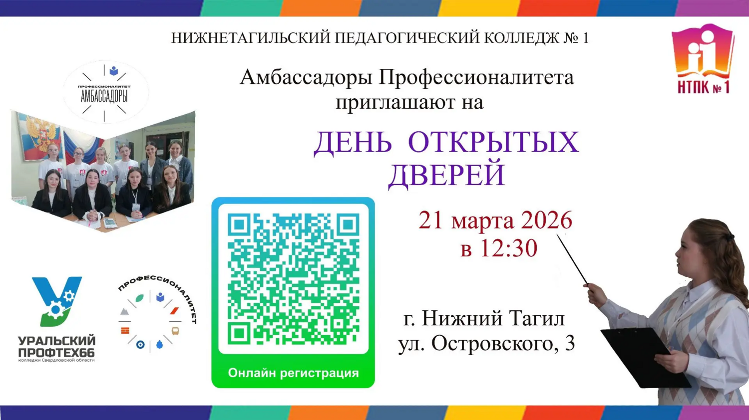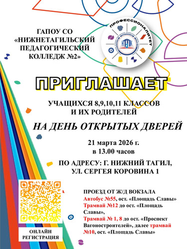 Нижнетагильский государственный социально-педагогический институт (филиал) федерального государственного автономного образовательного учреждения высшего образования «Уральский государственный педагогический университет» (далее – НТГСПИ (филиал) УрГПУ), в рамках профориентационной работы и привлечения абитуриентов в педагогическую профессию проводит 28 марта 2026 года с 10:00 по адресу ул. Красногвардейская, 57, г. Нижний Тагил профориентационное мероприятие «День открытых дверей» для обучающихся 9-11 классов и их родителей, а также для обучающихся выпускных курсов организаций СПО.