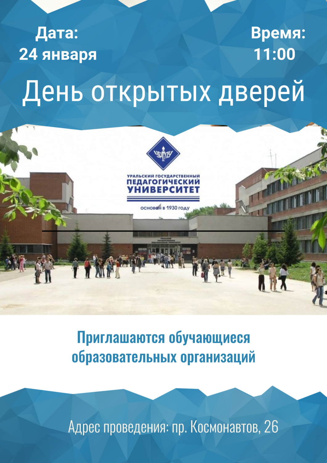 Напоминаем, что 24 января 2026г. ФГАОУ ВО «Уральский государственный педагогический университет» проводит День открытых дверей для обучающихся образовательных организаций в очном формате по адресу: г. Екатеринбург, пр. Космонавтов, 26.