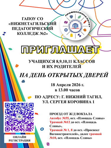 18 апреля 2026 г. ФГАОУ ВО «Уральский государственный педагогический университет» проводит День открытых дверей для обучающихся образовательных организаций в очном формате по адресу: г. Екатеринбург, ул. Карла Либкнехта, 9 А. В ходе мероприятия будут анонсированы основные образовательные программы бакалавриата, магистратуры, реализуемые университетом и среднепрофессионального образования, реализуемые университетским колледжем